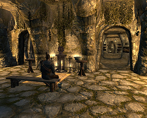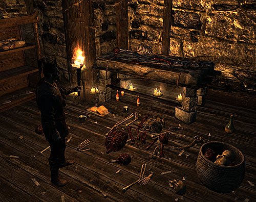 この町の死者の間はノルド遺跡のように気味悪いのですが、スケルトンがうろうろしていないぶん、ホワイトランやソリチュードよりしっかり管理されているように見えます。 遺体の埋葬処理をするヘルグリッドさんから、被害者は埋葬用の刃物で傷つけられていたことを教えてもらいました。こんな刃物を持っているのは、この町では自分くらいなはずだという彼女。