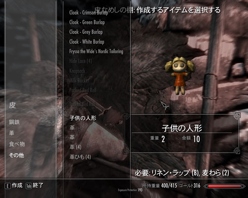 ハースファイアの人形が素っ裸で不憫だったので、ワンピースを着せてあげました。デフォルトの貧乏くさいお人形が好きなので、その雰囲気を損ねないボロいワンピースです。ついでに自作できるようレシピも作って、木刀と一緒に作成。
