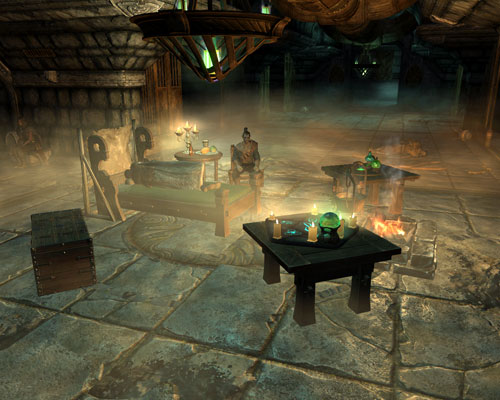 古ぼけた樽を骨で飾った手作り風の台に、恭しく掲げられた鶏の卵。お供えは巨人のつま先やら宝石やら。術士の近くには死んだ鶏。