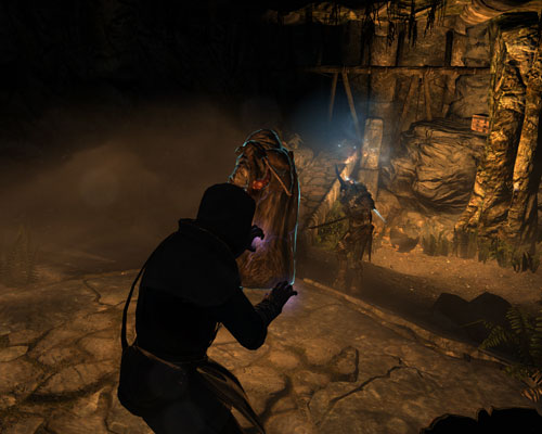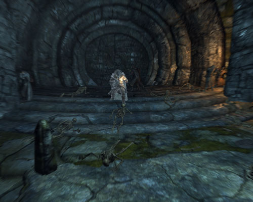 いかにもウィンターホールド大の生徒達が興味をそそられそうな場所です。一方でホワイトランへ抜ける道も遺跡内を通っているので、旅人もちょくちょく通ります。今日は帝国兵の人達が遺跡を通り抜けようとしていました。