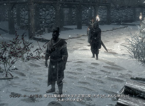 大学が変な障壁に覆われていました。ウィンターホールドの町の人は、この異常事態もメイジ大学がだから仕方ないとでも思ってるんじゃないでしょうか。慌ててるのは大学関係者だけの気がします。