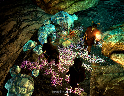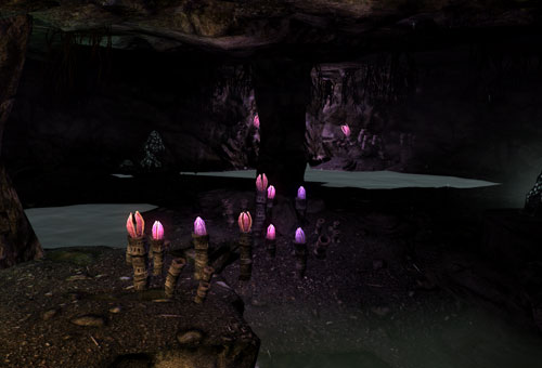 見たことのない植物か菌類かがはえていたり、岩に光る亀裂が走っていたり、これまでの洞窟とはかなり雰囲気が違います。