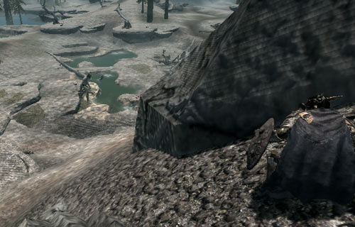 立ち枯れの木や倒木、小さな段差で巨人を翻弄しながらどうにか岩陰に隠れることができた。