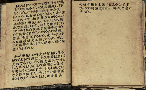 内容を読むと、南リーチにあるドゥーマー遺跡での研究結果のようだ。エセリウムという貴重な鉱物を奪い合った戦争で、アルクンザムズという都市がその中心になったらしい。