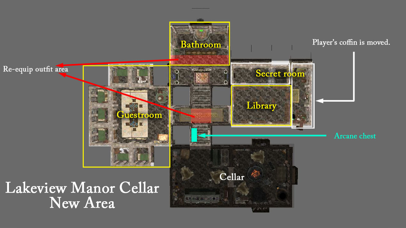 ・レイクビュー邸:NPC用ベッドルームの扉が自動ドア、隠し部屋に死霊術師向け死体置き場(棺桶並べています)
