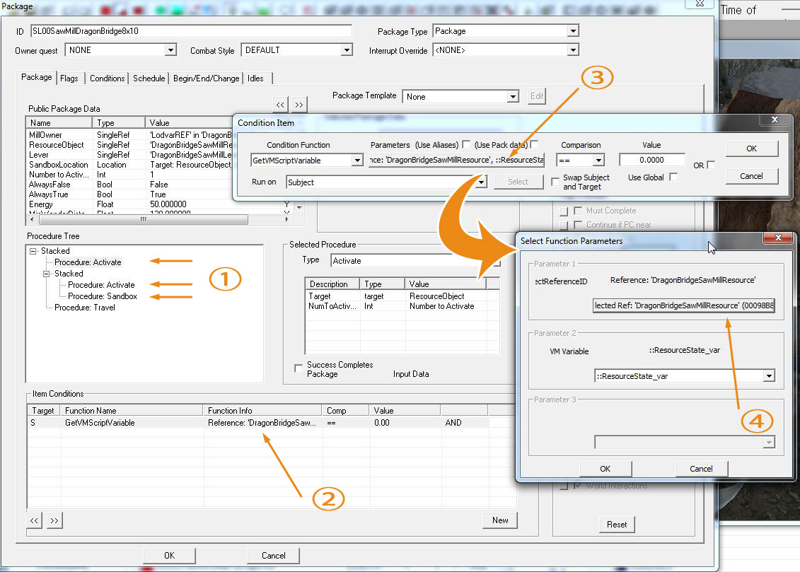 - AcquireRandomizeList?:FindLocation内で見つけたアイテムの取得する順番をランダムに並べ替えます。"False"にすると、FindLocationの中心に近いものから拾っていく傾向になるようです。複数のNPCがアイテムを拾う場合は"True"推奨。同じアイテムの取得競争にならずにすみます。