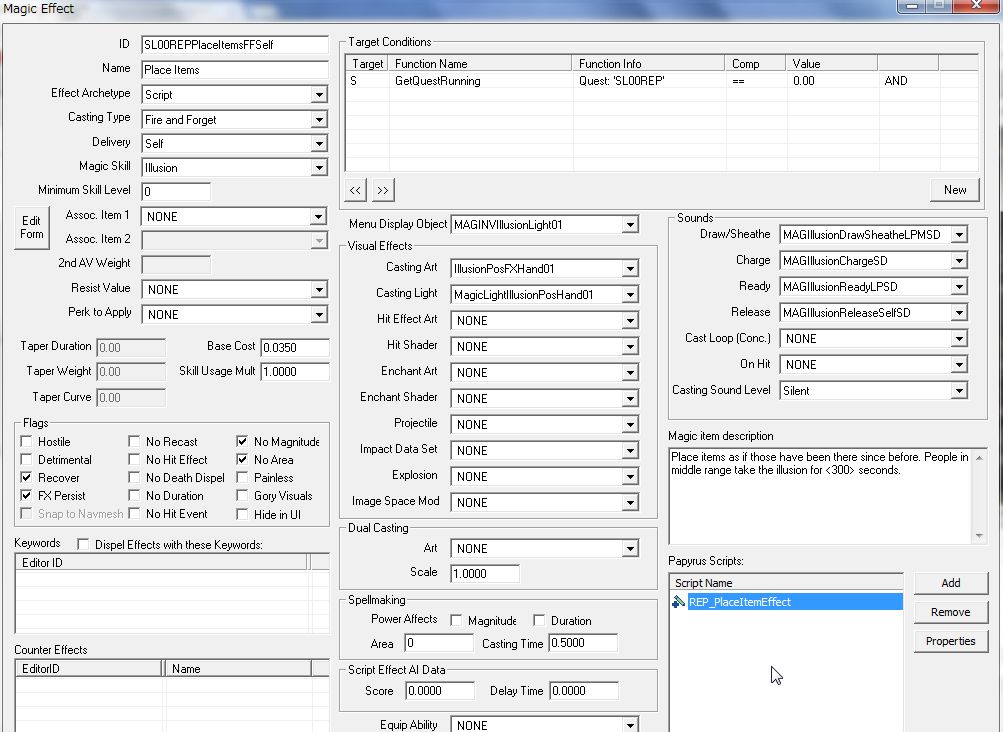 アイテム設置用の魔法はスカイリムならではの苦肉の策ですが、幻惑魔法として作り「人々に不審を抱かせず食べ物を置く」という説明をつけると案外リアリティが出る気がします。いくら食事時間だといっても、怪しい人物が目の前で落とした食べ物を拾って食べるのは変でしょうし(^-^;