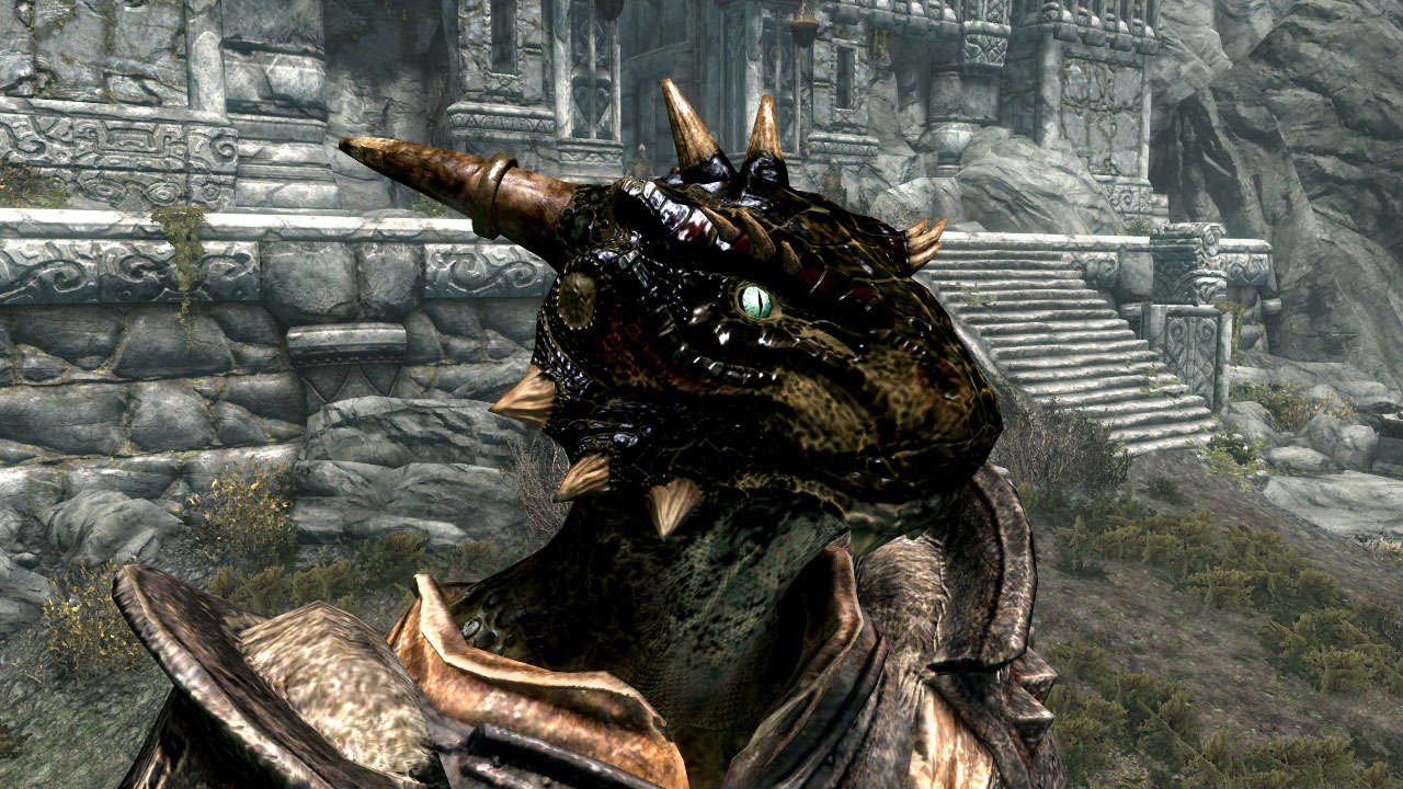現在プレイ中(超マイペース)のアルゴニアン君。鮮やかになったSkyrimに黒い鱗が映えます。光を遮るドラゴンの重厚感も素敵でしたが、アルゴニアンも前よりかっこよくなった気がします。