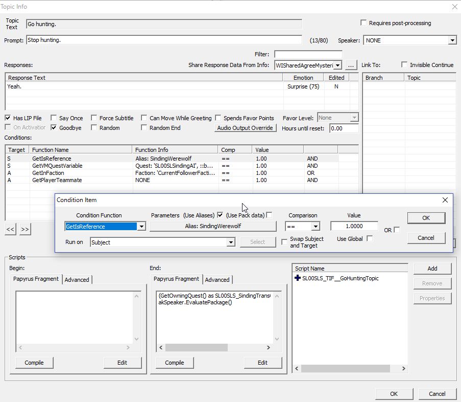 「GetIsAliasRef」です。バニラでは、DA05のQuestで使用されているのを確認。