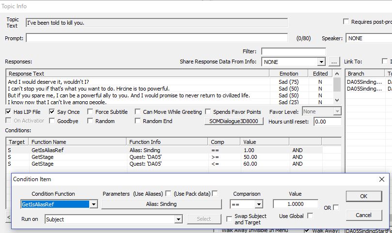 Responseウィンドウ下部には、各ボイスタイプ別ボイスファイルの一覧が表示されるところがあり、Topicに設定されたCondifion Functionsの条件に合致するボイスのみが並ぶようになっています。