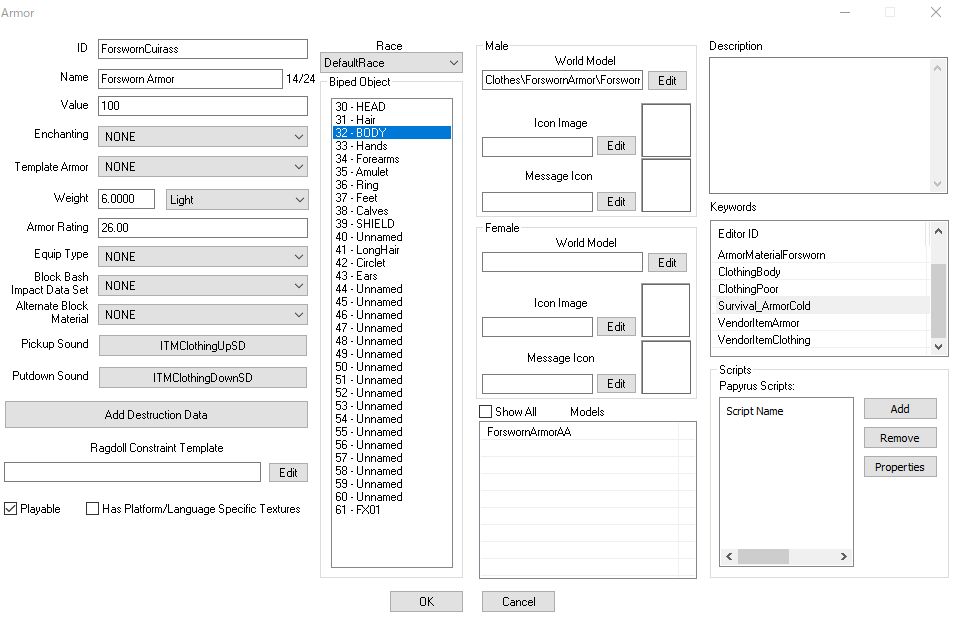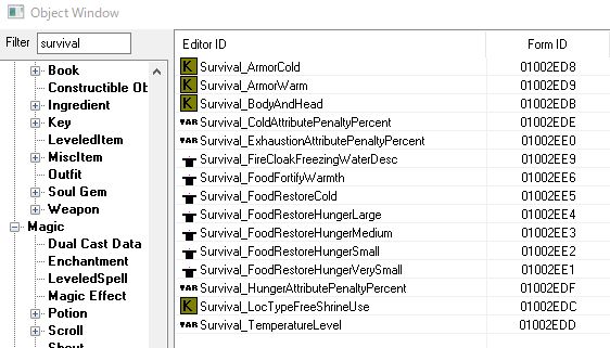 今回のバージョンアップか、サバイバルモードのダウンロードで、Update.esmにも変更が入るようです。中身を見てみると、サバイバルモード用の設定が追加されていました。