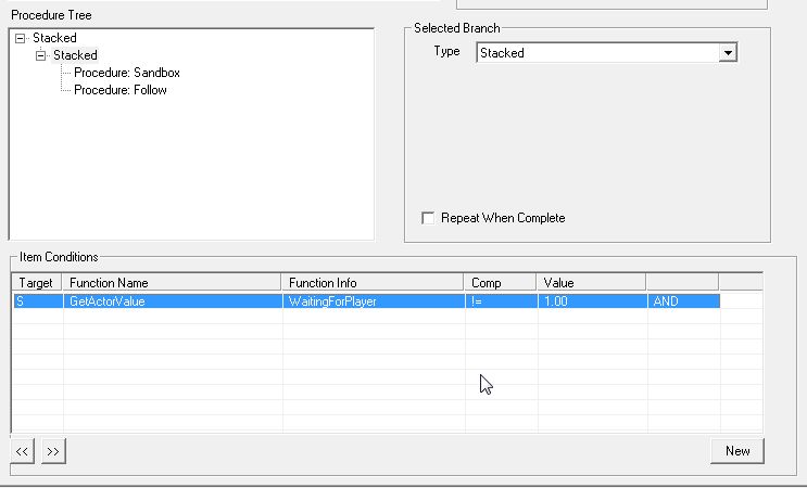 SandboxとFollowの親要素である「Stacked」Branchを選択し、下欄の「Item Conditions」にてこのBranchが実行される条件を決めます。