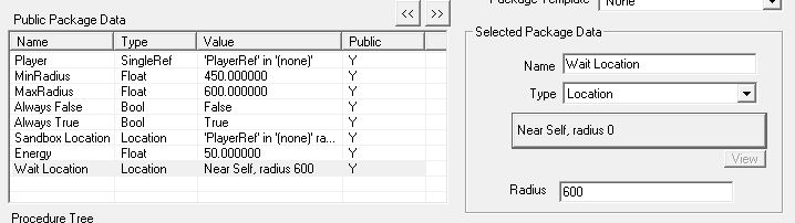 「Public Package Data」にて"Wait Location"を追加。あまり遠くに行かれると困るので、本人の周囲半径600でくつろいでもらうことにしました。