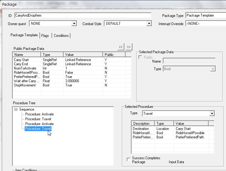 この3つの共通点は、Procedure Treeの一番上が"Procedure: Activate"になっているところです。AIがスタートすると、この"Procedure: Activate"で指定されたオブジェクトをすぐさまアクティベートしに行くようになっています。しかしこのProcedureは、本人とオブジェクトが同一セルか同じワールドにいないとなんらかの問題が生じ、AIが停止してNPCがその場で棒立ちになってしまうようです