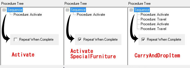 できるようになります。対象物と同じ場所にいなければAIが止まってしまう"Procedure: Activate"の直前で、"Procedure: Travel"が「動作主&対象物の引き合わせ」を確実に行ってくれる構造です。