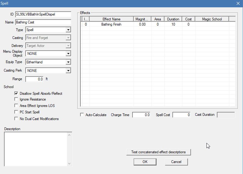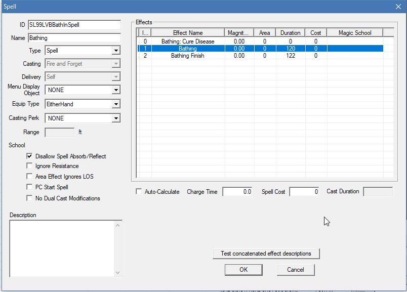 椅子などのFurnitureには、「Associated Spell」というその家具を使った人に自動適用する魔法を登録できる場所があります。今回はこの機能を使い、風呂の中に椅子などを置き、その椅子に脱衣魔法を取り付けることにしました。「椅子に座った」=「しばらくは風呂の中に浸かっていてくれる」という状況が確実に取れます。