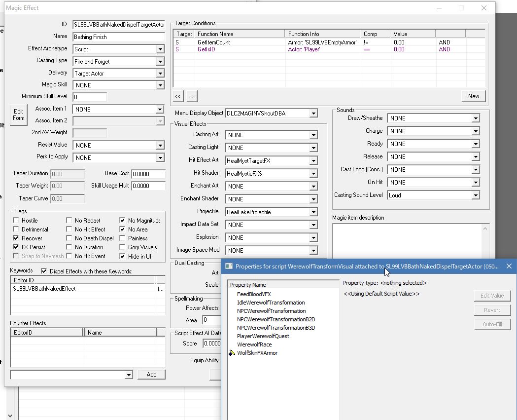 - 風呂から上がったNPCに何らかの方法を用いて、脱衣用の装備を持ち物欄から取り上げる。このタイミングで大体のNPCは自分のOutfit、フォロワーであれば最適装備に戻ってくれる。これも唯一見つけられたのが魔法Scriptだったので着衣魔法を作ります。ウェアウルフの変身用Scriptなので処理が多い。着衣魔法は脱衣魔法より若干処理が重いかも。