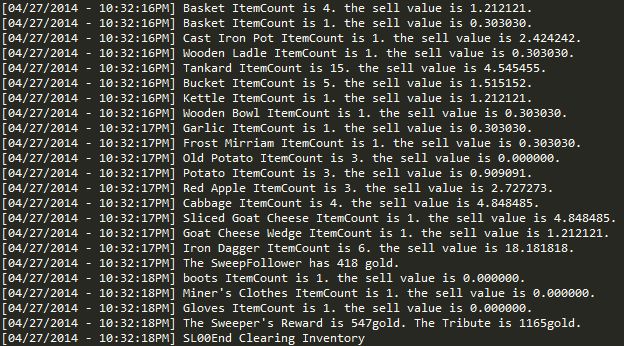 SKSEの”GetNthForm”で所持品から一種類ずつアイテムを取り出し、その値段に所持数を掛け合わせて、「話術スキル0」の時の売却係数で割ります。これを繰り返して、所持品を全て換金。