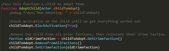これは養子にする際に行われる処理の冒頭ですが、これまで加入していたFactionを、CrimeFaction以外全消ししています。"