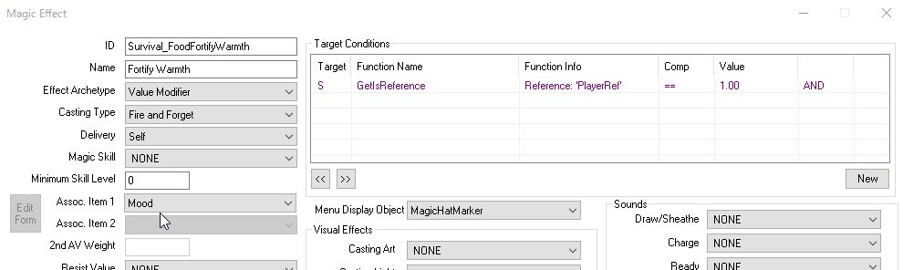 Assoc Item1に入っていますが、他の寒さや空腹に関するMagic Effectにも「Mood」が入ってました。仮の値かもしれないです。サバイバルモードのESLファイルで後から細かく変更するのかも。